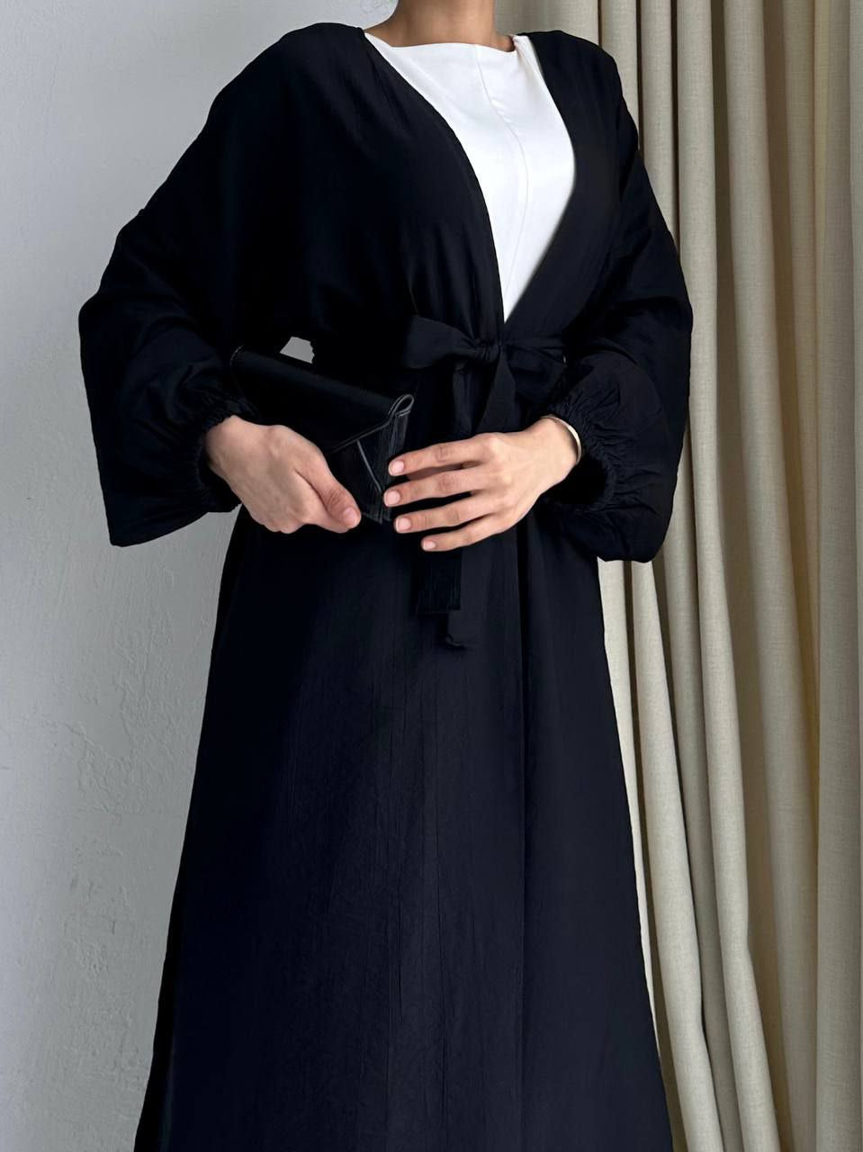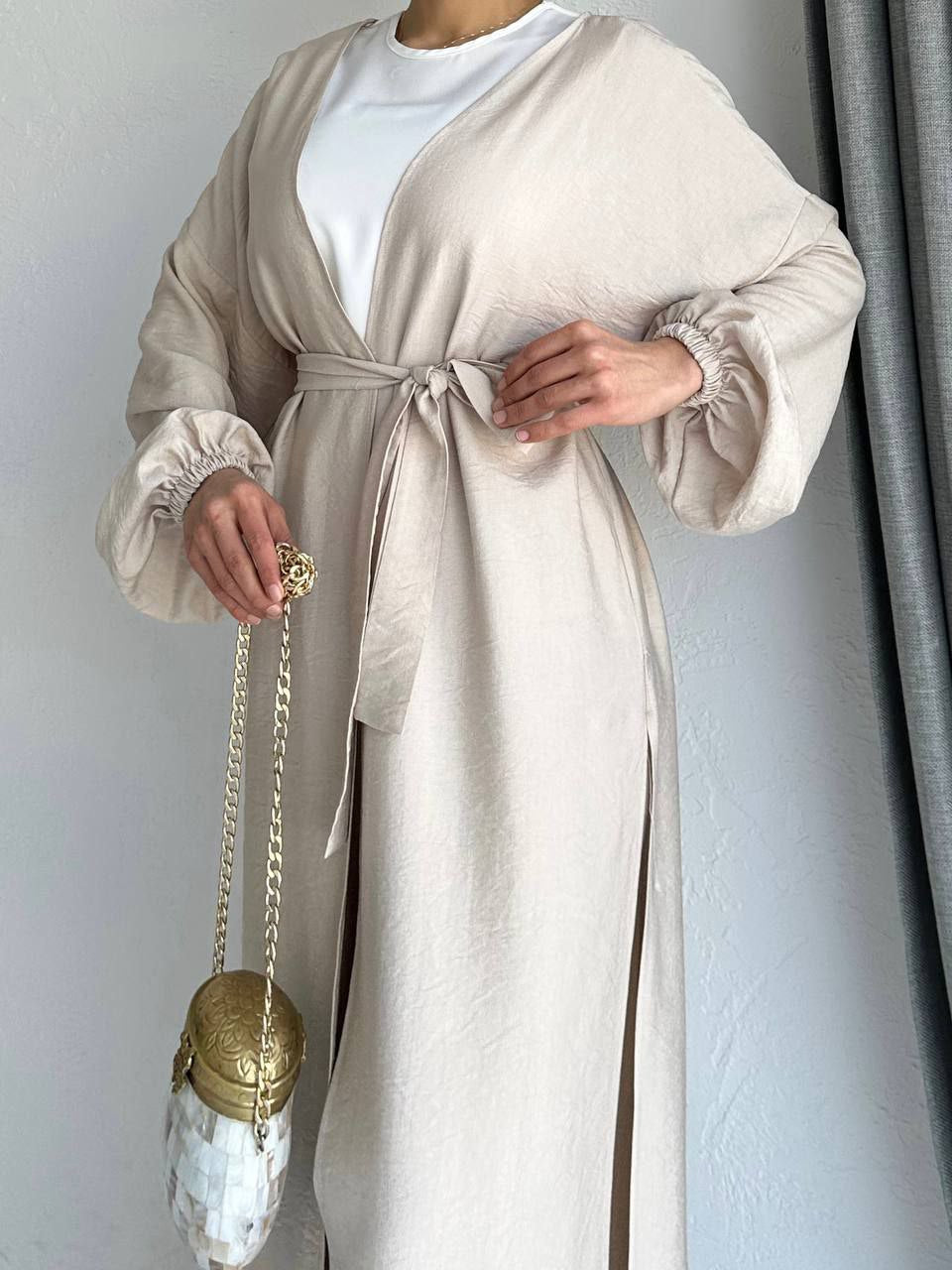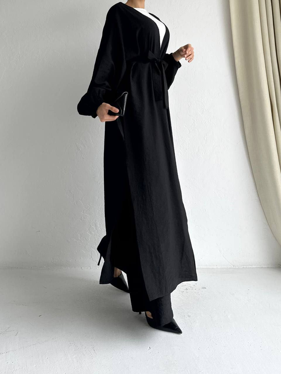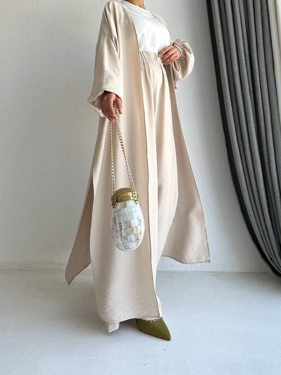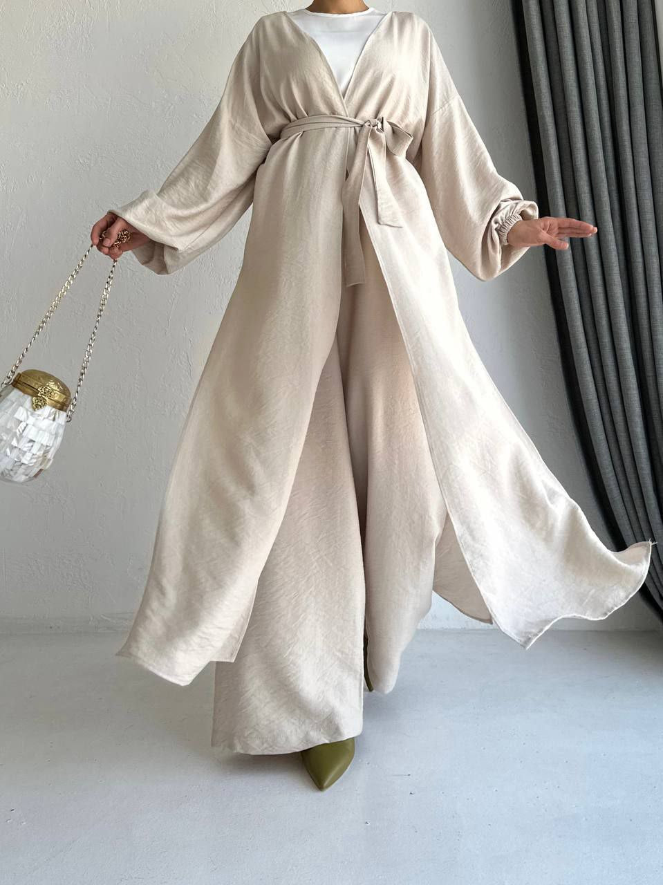 Das Oberteil des Sets ist mit seitlichem Schlitz und hat einen Gürtel. Das Oberteil hat keine Knöpfe. Die Hose ist mit weitem Bein und mit Gummiband. Die Hose hat Hosen-Taschen.