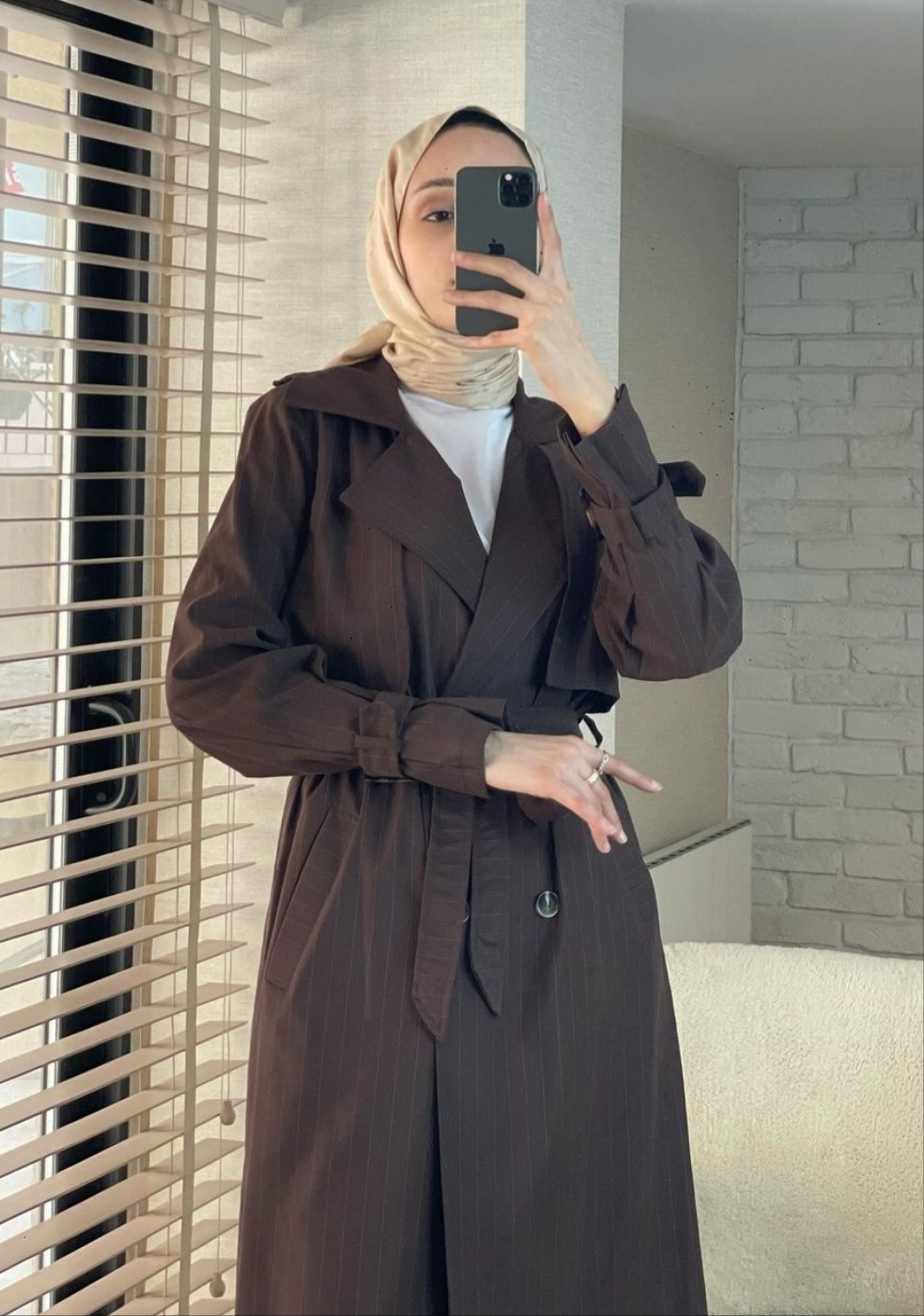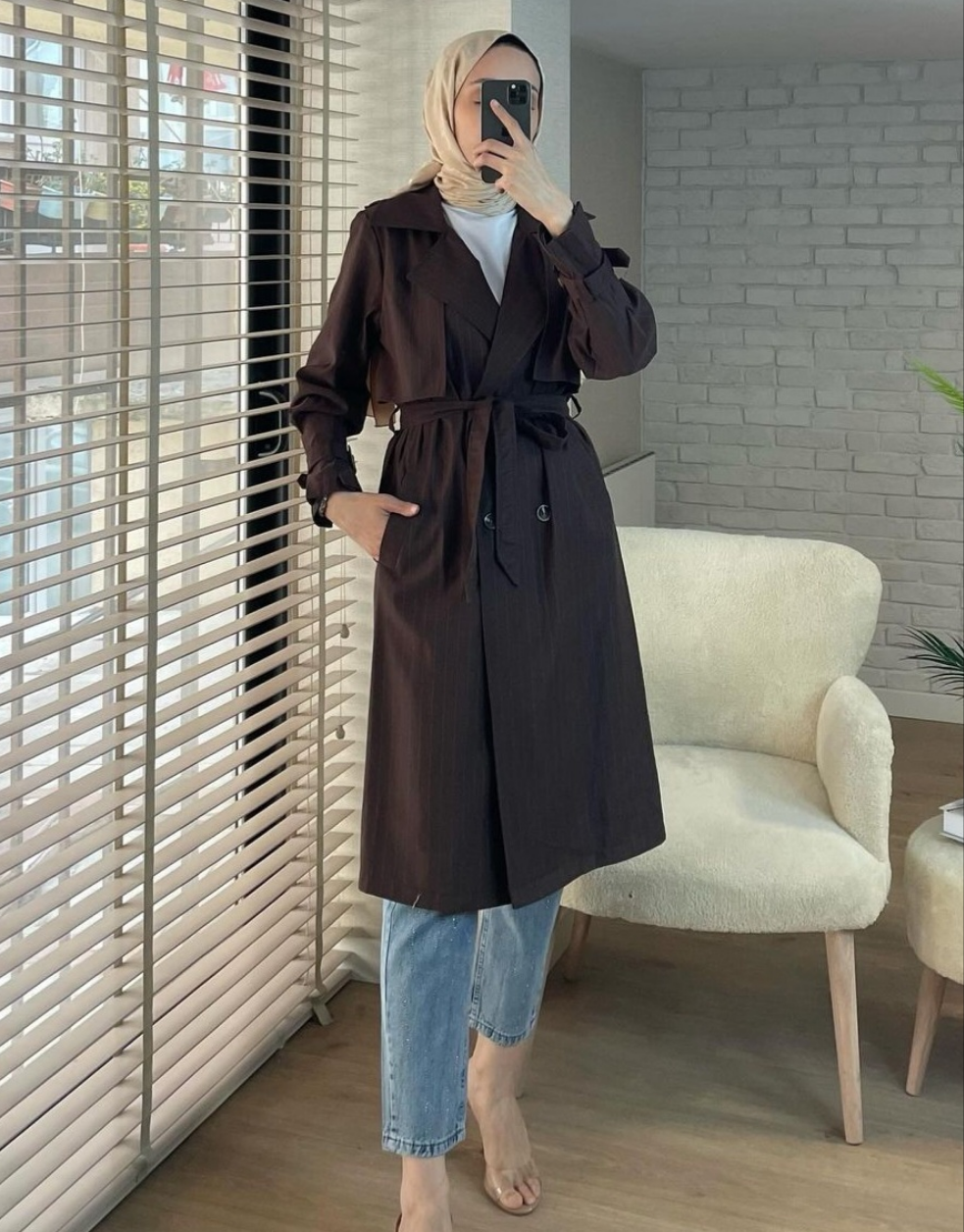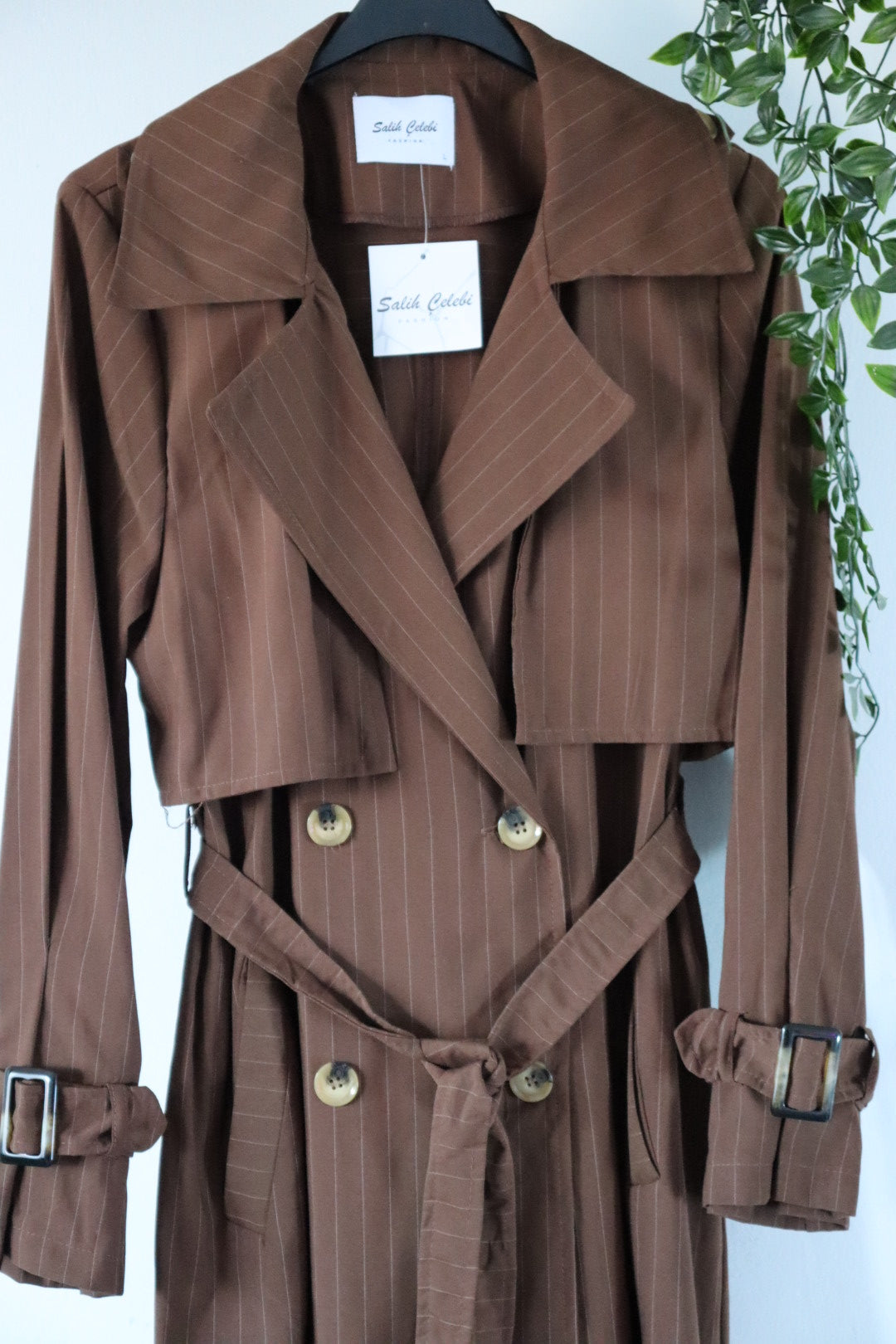Trenchcoat mit feinen, senkrechten Nadelstreifen, die einen dezenten Business-Look verleihen.